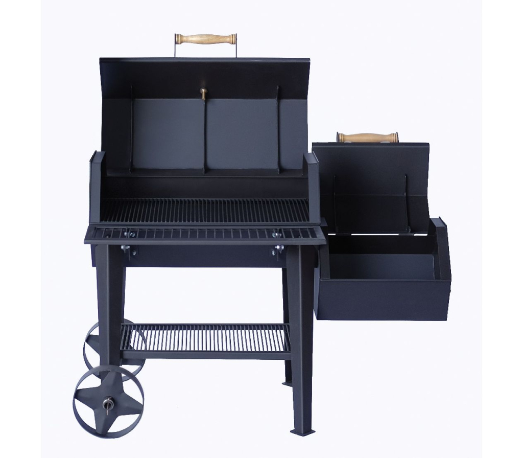3.Горизонтальная камера в форме бочки (габариты 800x500 мм) – рабочая зона для барбекю, гриля и горячего копчения. Оборудована крышкой, открывающей внутреннюю полость по всей длине. А также решетками из нержавеющей пищевой стали и: внутренней и наружной (прикреплена/приварена сбоку корпуса).