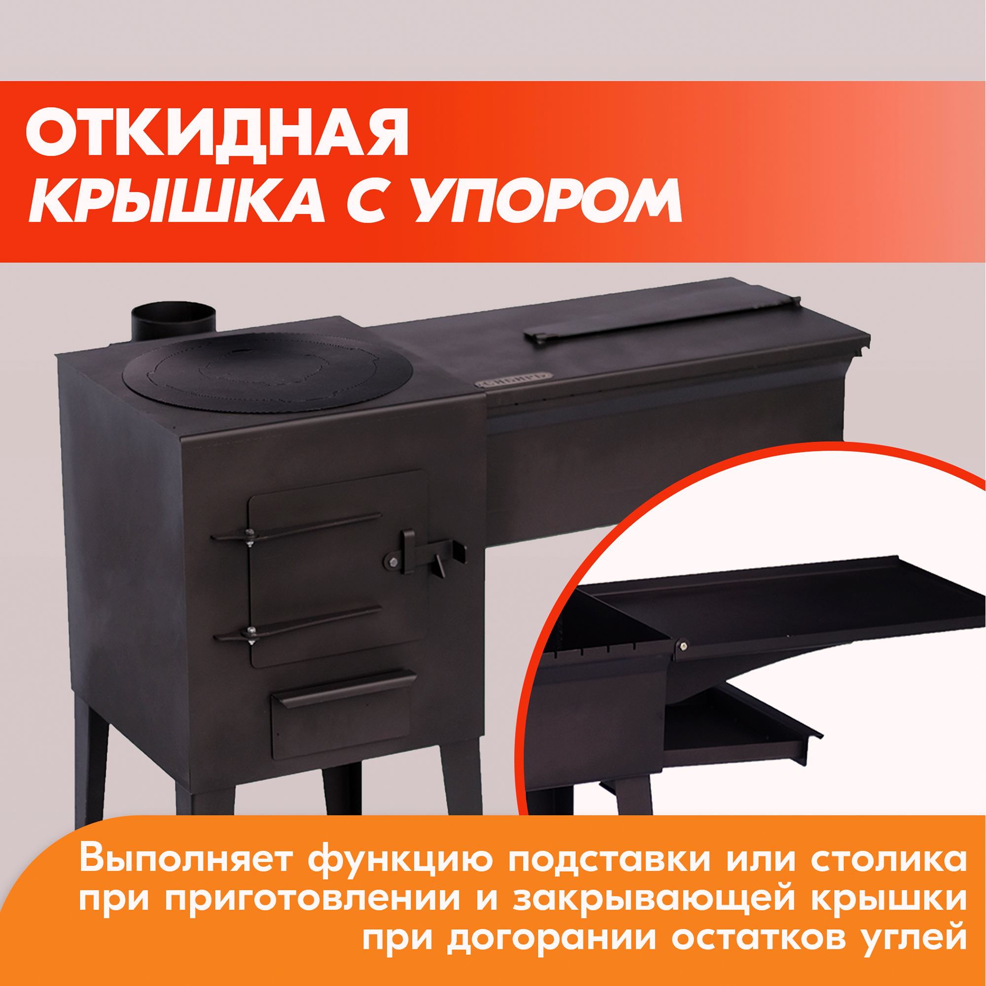 Основным преимуществом металлического казана-мангала «Сибирь» является откидная крышка с упором, выполняющая функцию подставки или столика при приготовлении и закрывающей крышки при догорании остатков углей после приготовления.