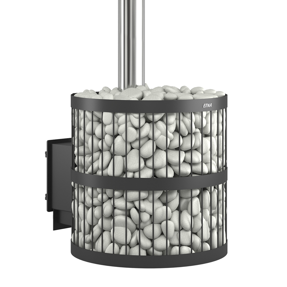 Для устройства наружной открытой каменки печь ЭТНА 24 оснащается металлическим кожухом с прорезным рисунком оригинального дизайна. Пространство между печью и кожухом из двухмиллиметровой стали заполняется камнями для бани, которые выполняют роль теплонакопителя, перераспределяют тепло от стенок топки и защищают парящихся от жёсткого инфракрасного излучения. Воду подают на нагретые камни, с которых полученный пар распространяется по всему объёму парной. Кожух диаметром 560 миллиметров вмещает в себя до 110 килограммов камней крупной и средней фракции.