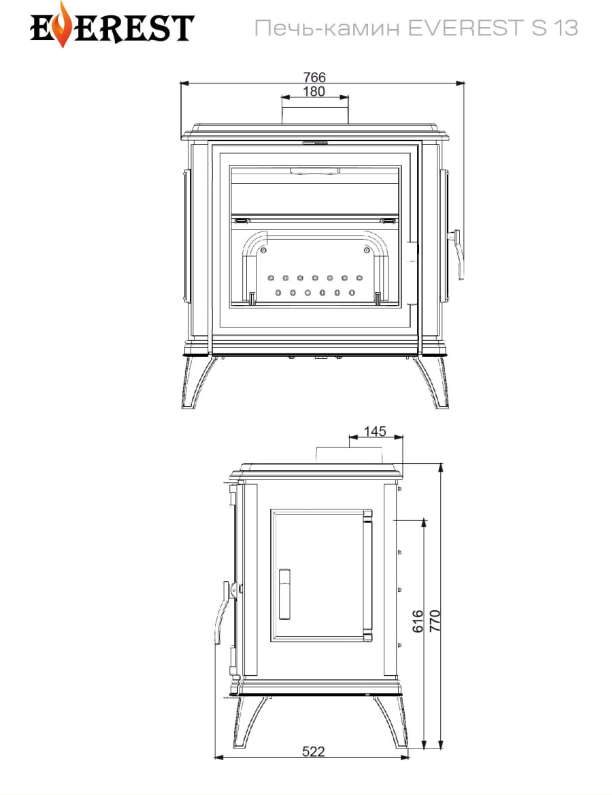 Печь-камин EVEREST S13 для больших помещений (до 260 м³), с большим стеклом и двумя дверками. Через стеклянную дверку печи-камина серии EVEREST S13 приятно наблюдать за огнём, а глухая боковая дверь нужна для очистки топки и уходом за пламегасителем и дымоходом.