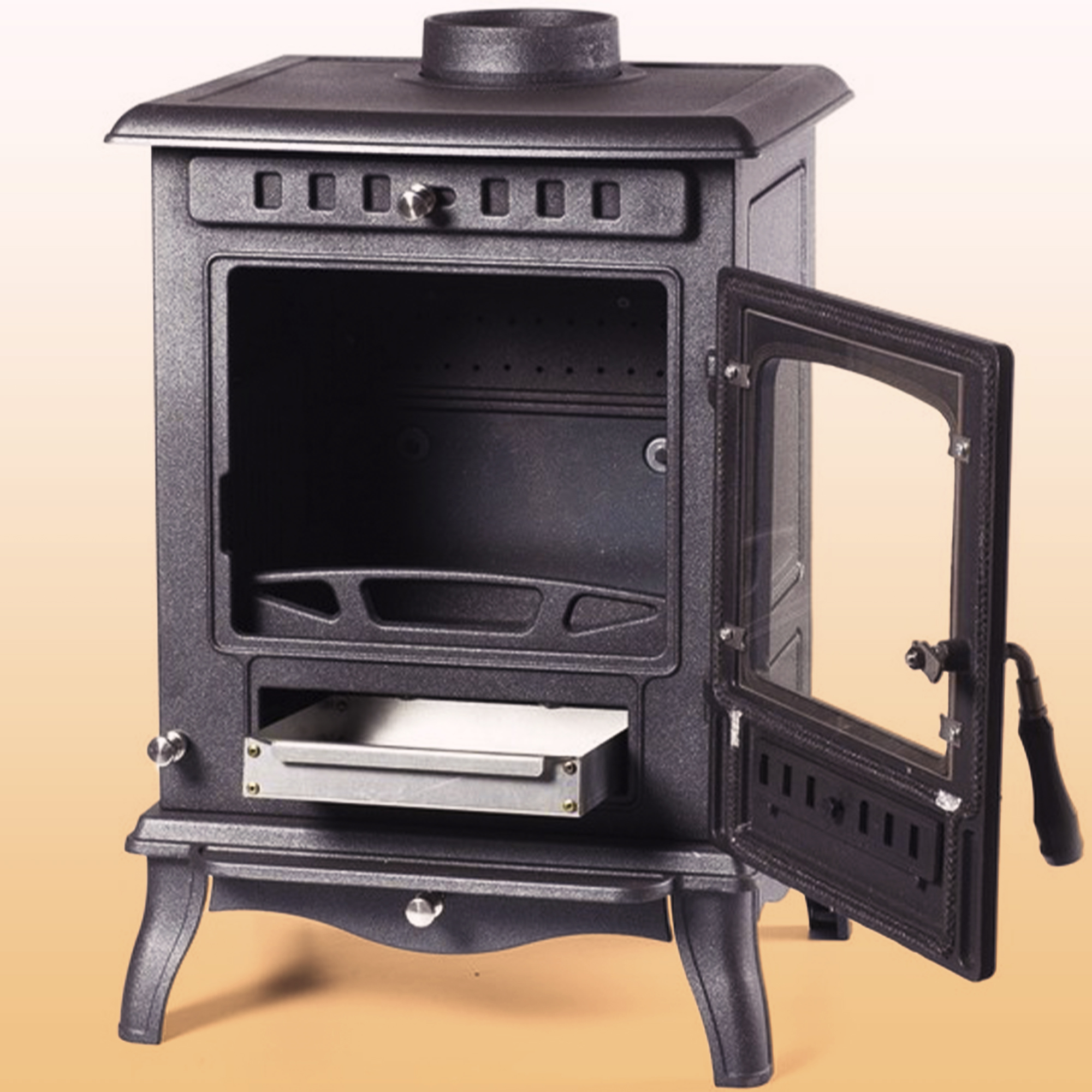 - ограничитель для дров не дает поленьям царапать стекло.