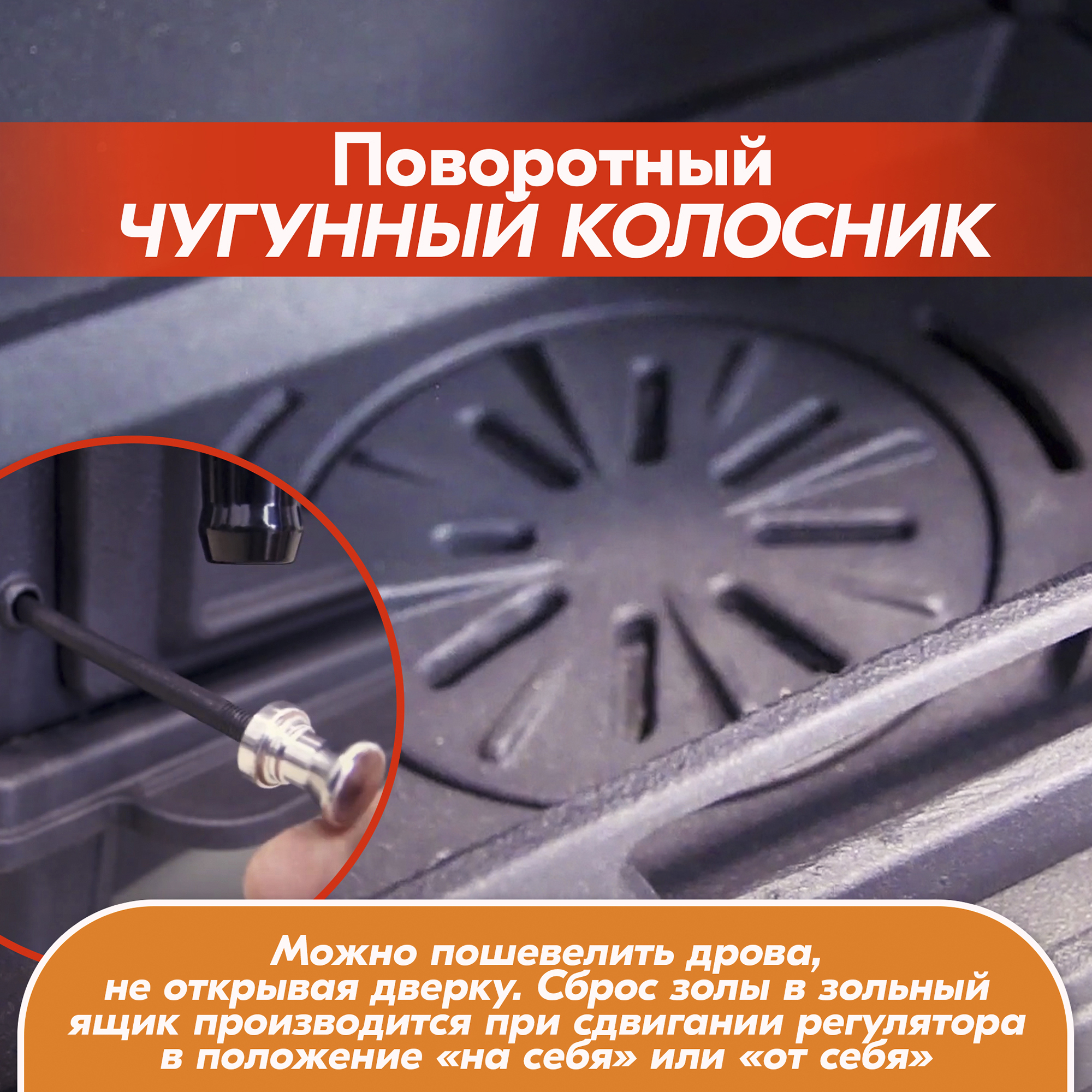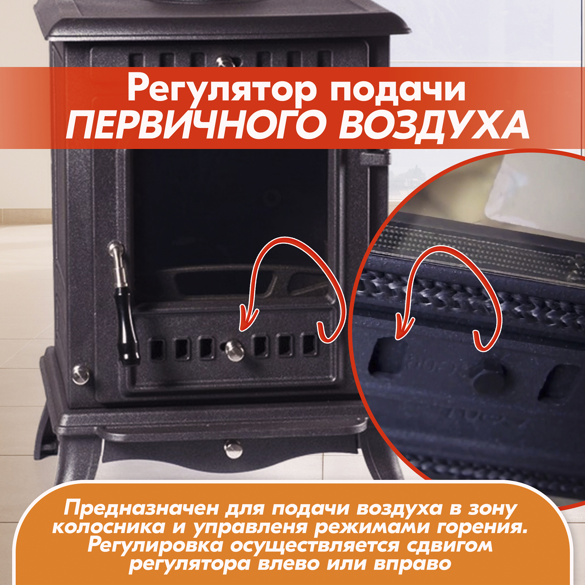 Первичный регулятор воздуха расположен в нижней части дверки и предназначен для подачи воздуха в зону колосника.