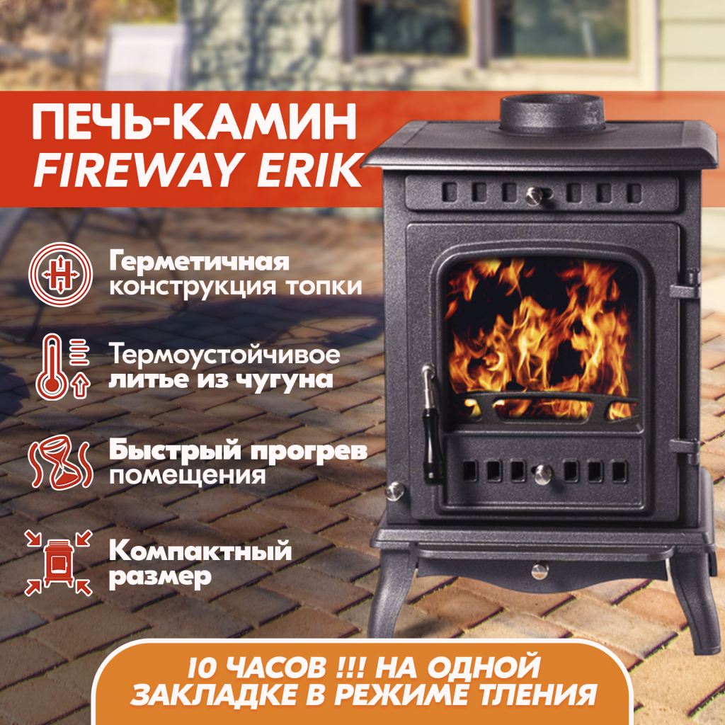 Чугунная печь-камин FireWay (ФаирВэй) Erik (Эрик) – это функциональная, компактная и красивая отопительная печь для загородного дома или дачи, эффективно накапливает тепло и долго остывает.