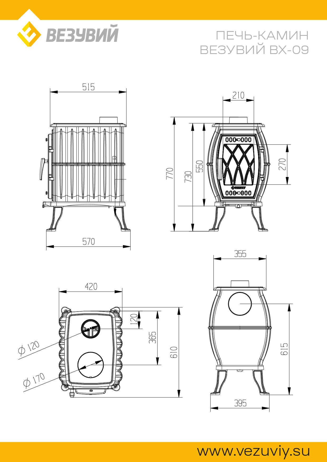 Печь-камин Везувий ВХ-09 "Антрацит" изготовлена из качественного жаростойкого чугуна с толщиной стенок 6-8 мм. Модель рассчитана на обогрев помещений объёмом до 180 м³. Печь-камин имеет пламегаситель изготовлен из чугуна. В Топки печи-камина установлена система двухуровневого вторичного дожига. С помощью этой функции по специальному каналу поступает воздух, который нагревается при прохождении между топочной камерой и задней стенкой корпуса. Далее нагретый воздух через дефлектор поступает в топку, перемешивается с газами - продуктами горения, чем вызывает повторное возгорание. Регулировка этой системы, осуществляется заслонкой, расположенной в нижней части печи-камина. Регулировка подачи воздуха в колосниковую зону осуществляется заслонкой, расположенной в нижней части двери. В верхней части двери расположена ручка регулировки системы чистое стекло, которая помогает оставаться стеклу чистым. Патрубок дымохода Ø 120 мм – универсальный, со сменным положением.