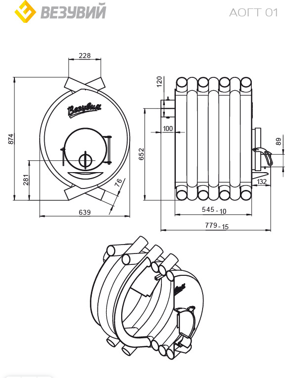 Печь отопительная ВЕЗУВИЙ АОГТ 01 предназначена для обогрева бытовых нежилых и промышленных помещений. Печь рассчитана на обогрев помещений объёмом 200 кубических метров.